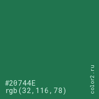 Цвет #20744E в цветовой модели RGB обозначается тремя октетами (32, 116, 78) в десятичном формате и #20744E в шестнадцатиричном (hex) формате, которые являются интенсивностью красного 32 (hex 20), интенсивность зелёного 116 (hex 74) и интенсивность синего 78 (hex 4E).