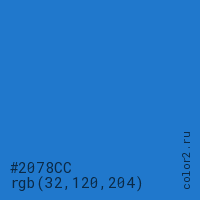 Цвет #2078CC в цветовой модели RGB обозначается тремя октетами (32, 120, 204) в десятичном формате и #2078CC в шестнадцатиричном (hex) формате, которые являются интенсивностью красного 32 (hex 20), интенсивность зелёного 120 (hex 78) и интенсивность синего 204 (hex CC).