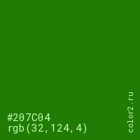 Цвет #207C04 в цветовой модели RGB обозначается тремя октетами (32, 124, 4) в десятичном формате и #207C04 в шестнадцатиричном (hex) формате, которые являются интенсивностью красного 32 (hex 20), интенсивность зелёного 124 (hex 7C) и интенсивность синего 4 (hex 04).