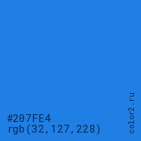 Цвет #207FE4 в цветовой модели RGB обозначается тремя октетами (32, 127, 228) в десятичном формате и #207FE4 в шестнадцатиричном (hex) формате, которые являются интенсивностью красного 32 (hex 20), интенсивность зелёного 127 (hex 7F) и интенсивность синего 228 (hex E4).
