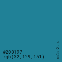 Цвет #208197 в цветовой модели RGB обозначается тремя октетами (32, 129, 151) в десятичном формате и #208197 в шестнадцатиричном (hex) формате, которые являются интенсивностью красного 32 (hex 20), интенсивность зелёного 129 (hex 81) и интенсивность синего 151 (hex 97).