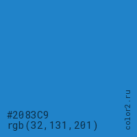 Цвет #2083C9 в цветовой модели RGB обозначается тремя октетами (32, 131, 201) в десятичном формате и #2083C9 в шестнадцатиричном (hex) формате, которые являются интенсивностью красного 32 (hex 20), интенсивность зелёного 131 (hex 83) и интенсивность синего 201 (hex C9).