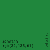 Цвет #20873D в цветовой модели RGB обозначается тремя октетами (32, 135, 61) в десятичном формате и #20873D в шестнадцатиричном (hex) формате, которые являются интенсивностью красного 32 (hex 20), интенсивность зелёного 135 (hex 87) и интенсивность синего 61 (hex 3D).