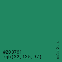 Цвет #208761 в цветовой модели RGB обозначается тремя октетами (32, 135, 97) в десятичном формате и #208761 в шестнадцатиричном (hex) формате, которые являются интенсивностью красного 32 (hex 20), интенсивность зелёного 135 (hex 87) и интенсивность синего 97 (hex 61).