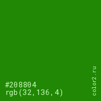 Цвет #208804 в цветовой модели RGB обозначается тремя октетами (32, 136, 4) в десятичном формате и #208804 в шестнадцатиричном (hex) формате, которые являются интенсивностью красного 32 (hex 20), интенсивность зелёного 136 (hex 88) и интенсивность синего 4 (hex 04).