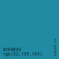 Цвет #208BA3 в цветовой модели RGB обозначается тремя октетами (32, 139, 163) в десятичном формате и #208BA3 в шестнадцатиричном (hex) формате, которые являются интенсивностью красного 32 (hex 20), интенсивность зелёного 139 (hex 8B) и интенсивность синего 163 (hex A3).