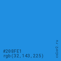 Цвет #208FE1 в цветовой модели RGB обозначается тремя октетами (32, 143, 225) в десятичном формате и #208FE1 в шестнадцатиричном (hex) формате, которые являются интенсивностью красного 32 (hex 20), интенсивность зелёного 143 (hex 8F) и интенсивность синего 225 (hex E1).