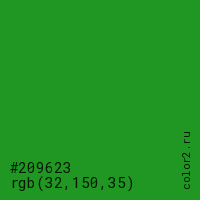 Цвет #209623 в цветовой модели RGB обозначается тремя октетами (32, 150, 35) в десятичном формате и #209623 в шестнадцатиричном (hex) формате, которые являются интенсивностью красного 32 (hex 20), интенсивность зелёного 150 (hex 96) и интенсивность синего 35 (hex 23).