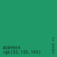 Цвет #209969 в цветовой модели RGB обозначается тремя октетами (32, 153, 105) в десятичном формате и #209969 в шестнадцатиричном (hex) формате, которые являются интенсивностью красного 32 (hex 20), интенсивность зелёного 153 (hex 99) и интенсивность синего 105 (hex 69).
