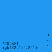 Цвет #209AF1 в цветовой модели RGB обозначается тремя октетами (32, 154, 241) в десятичном формате и #209AF1 в шестнадцатиричном (hex) формате, которые являются интенсивностью красного 32 (hex 20), интенсивность зелёного 154 (hex 9A) и интенсивность синего 241 (hex F1).