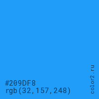 Цвет #209DF8 в цветовой модели RGB обозначается тремя октетами (32, 157, 248) в десятичном формате и #209DF8 в шестнадцатиричном (hex) формате, которые являются интенсивностью красного 32 (hex 20), интенсивность зелёного 157 (hex 9D) и интенсивность синего 248 (hex F8).
