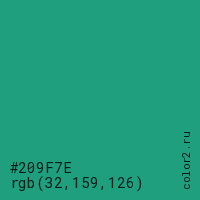 Цвет #209F7E в цветовой модели RGB обозначается тремя октетами (32, 159, 126) в десятичном формате и #209F7E в шестнадцатиричном (hex) формате, которые являются интенсивностью красного 32 (hex 20), интенсивность зелёного 159 (hex 9F) и интенсивность синего 126 (hex 7E).