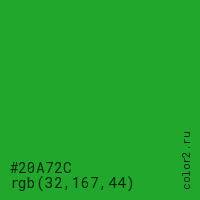 Цвет #20A72C в цветовой модели RGB обозначается тремя октетами (32, 167, 44) в десятичном формате и #20A72C в шестнадцатиричном (hex) формате, которые являются интенсивностью красного 32 (hex 20), интенсивность зелёного 167 (hex A7) и интенсивность синего 44 (hex 2C).
