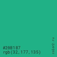 Цвет #20B187 в цветовой модели RGB обозначается тремя октетами (32, 177, 135) в десятичном формате и #20B187 в шестнадцатиричном (hex) формате, которые являются интенсивностью красного 32 (hex 20), интенсивность зелёного 177 (hex B1) и интенсивность синего 135 (hex 87).