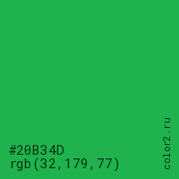 Цвет #20B34D в цветовой модели RGB обозначается тремя октетами (32, 179, 77) в десятичном формате и #20B34D в шестнадцатиричном (hex) формате, которые являются интенсивностью красного 32 (hex 20), интенсивность зелёного 179 (hex B3) и интенсивность синего 77 (hex 4D).