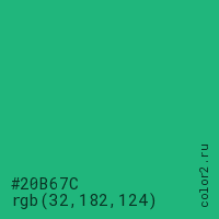 Цвет #20B67C в цветовой модели RGB обозначается тремя октетами (32, 182, 124) в десятичном формате и #20B67C в шестнадцатиричном (hex) формате, которые являются интенсивностью красного 32 (hex 20), интенсивность зелёного 182 (hex B6) и интенсивность синего 124 (hex 7C).