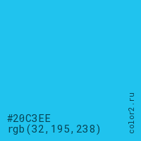 Цвет #20C3EE в цветовой модели RGB обозначается тремя октетами (32, 195, 238) в десятичном формате и #20C3EE в шестнадцатиричном (hex) формате, которые являются интенсивностью красного 32 (hex 20), интенсивность зелёного 195 (hex C3) и интенсивность синего 238 (hex EE).