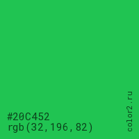 Цвет #20C452 в цветовой модели RGB обозначается тремя октетами (32, 196, 82) в десятичном формате и #20C452 в шестнадцатиричном (hex) формате, которые являются интенсивностью красного 32 (hex 20), интенсивность зелёного 196 (hex C4) и интенсивность синего 82 (hex 52).