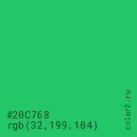 Цвет #20C768 в цветовой модели RGB обозначается тремя октетами (32, 199, 104) в десятичном формате и #20C768 в шестнадцатиричном (hex) формате, которые являются интенсивностью красного 32 (hex 20), интенсивность зелёного 199 (hex C7) и интенсивность синего 104 (hex 68).