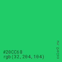 Цвет #20CC68 в цветовой модели RGB обозначается тремя октетами (32, 204, 104) в десятичном формате и #20CC68 в шестнадцатиричном (hex) формате, которые являются интенсивностью красного 32 (hex 20), интенсивность зелёного 204 (hex CC) и интенсивность синего 104 (hex 68).