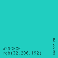 Цвет #20CEC0 в цветовой модели RGB обозначается тремя октетами (32, 206, 192) в десятичном формате и #20CEC0 в шестнадцатиричном (hex) формате, которые являются интенсивностью красного 32 (hex 20), интенсивность зелёного 206 (hex CE) и интенсивность синего 192 (hex C0).