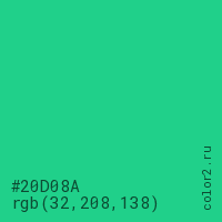 Цвет #20D08A в цветовой модели RGB обозначается тремя октетами (32, 208, 138) в десятичном формате и #20D08A в шестнадцатиричном (hex) формате, которые являются интенсивностью красного 32 (hex 20), интенсивность зелёного 208 (hex D0) и интенсивность синего 138 (hex 8A).