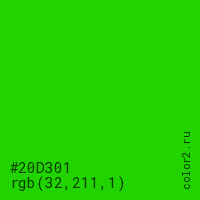 Цвет #20D301 в цветовой модели RGB обозначается тремя октетами (32, 211, 1) в десятичном формате и #20D301 в шестнадцатиричном (hex) формате, которые являются интенсивностью красного 32 (hex 20), интенсивность зелёного 211 (hex D3) и интенсивность синего 1 (hex 01).
