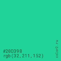 Цвет #20D398 в цветовой модели RGB обозначается тремя октетами (32, 211, 152) в десятичном формате и #20D398 в шестнадцатиричном (hex) формате, которые являются интенсивностью красного 32 (hex 20), интенсивность зелёного 211 (hex D3) и интенсивность синего 152 (hex 98).