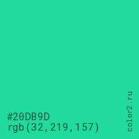 Цвет #20DB9D в цветовой модели RGB обозначается тремя октетами (32, 219, 157) в десятичном формате и #20DB9D в шестнадцатиричном (hex) формате, которые являются интенсивностью красного 32 (hex 20), интенсивность зелёного 219 (hex DB) и интенсивность синего 157 (hex 9D).