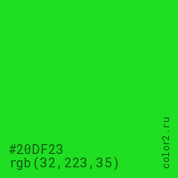 Цвет #20DF23 в цветовой модели RGB обозначается тремя октетами (32, 223, 35) в десятичном формате и #20DF23 в шестнадцатиричном (hex) формате, которые являются интенсивностью красного 32 (hex 20), интенсивность зелёного 223 (hex DF) и интенсивность синего 35 (hex 23).
