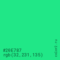 Цвет #20E787 в цветовой модели RGB обозначается тремя октетами (32, 231, 135) в десятичном формате и #20E787 в шестнадцатиричном (hex) формате, которые являются интенсивностью красного 32 (hex 20), интенсивность зелёного 231 (hex E7) и интенсивность синего 135 (hex 87).