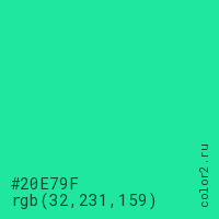 Цвет #20E79F в цветовой модели RGB обозначается тремя октетами (32, 231, 159) в десятичном формате и #20E79F в шестнадцатиричном (hex) формате, которые являются интенсивностью красного 32 (hex 20), интенсивность зелёного 231 (hex E7) и интенсивность синего 159 (hex 9F).