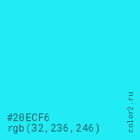 Цвет #20ECF6 в цветовой модели RGB обозначается тремя октетами (32, 236, 246) в десятичном формате и #20ECF6 в шестнадцатиричном (hex) формате, которые являются интенсивностью красного 32 (hex 20), интенсивность зелёного 236 (hex EC) и интенсивность синего 246 (hex F6).