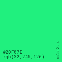 Цвет #20F07E в цветовой модели RGB обозначается тремя октетами (32, 240, 126) в десятичном формате и #20F07E в шестнадцатиричном (hex) формате, которые являются интенсивностью красного 32 (hex 20), интенсивность зелёного 240 (hex F0) и интенсивность синего 126 (hex 7E).