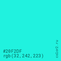 Цвет #20F2DF в цветовой модели RGB обозначается тремя октетами (32, 242, 223) в десятичном формате и #20F2DF в шестнадцатиричном (hex) формате, которые являются интенсивностью красного 32 (hex 20), интенсивность зелёного 242 (hex F2) и интенсивность синего 223 (hex DF).