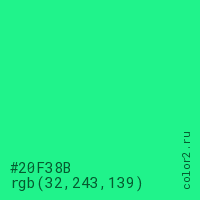 Цвет #20F38B в цветовой модели RGB обозначается тремя октетами (32, 243, 139) в десятичном формате и #20F38B в шестнадцатиричном (hex) формате, которые являются интенсивностью красного 32 (hex 20), интенсивность зелёного 243 (hex F3) и интенсивность синего 139 (hex 8B).