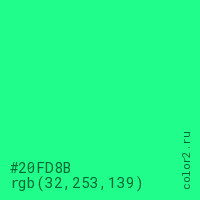 Цвет #20FD8B в цветовой модели RGB обозначается тремя октетами (32, 253, 139) в десятичном формате и #20FD8B в шестнадцатиричном (hex) формате, которые являются интенсивностью красного 32 (hex 20), интенсивность зелёного 253 (hex FD) и интенсивность синего 139 (hex 8B).