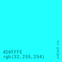Цвет #20FFFE в цветовой модели RGB обозначается тремя октетами (32, 255, 254) в десятичном формате и #20FFFE в шестнадцатиричном (hex) формате, которые являются интенсивностью красного 32 (hex 20), интенсивность зелёного 255 (hex FF) и интенсивность синего 254 (hex FE).