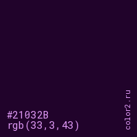 Цвет #21032B в цветовой модели RGB обозначается тремя октетами (33, 3, 43) в десятичном формате и #21032B в шестнадцатиричном (hex) формате, которые являются интенсивностью красного 33 (hex 21), интенсивность зелёного 3 (hex 03) и интенсивность синего 43 (hex 2B).