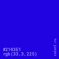 Цвет #2103E1 в цветовой модели RGB обозначается тремя октетами (33, 3, 225) в десятичном формате и #2103E1 в шестнадцатиричном (hex) формате, которые являются интенсивностью красного 33 (hex 21), интенсивность зелёного 3 (hex 03) и интенсивность синего 225 (hex E1).