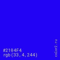 Цвет #2104F4 в цветовой модели RGB обозначается тремя октетами (33, 4, 244) в десятичном формате и #2104F4 в шестнадцатиричном (hex) формате, которые являются интенсивностью красного 33 (hex 21), интенсивность зелёного 4 (hex 04) и интенсивность синего 244 (hex F4).