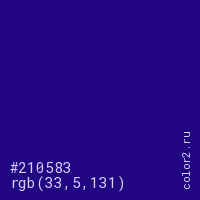 Цвет #210583 в цветовой модели RGB обозначается тремя октетами (33, 5, 131) в десятичном формате и #210583 в шестнадцатиричном (hex) формате, которые являются интенсивностью красного 33 (hex 21), интенсивность зелёного 5 (hex 05) и интенсивность синего 131 (hex 83).