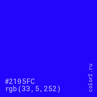 Цвет #2105FC в цветовой модели RGB обозначается тремя октетами (33, 5, 252) в десятичном формате и #2105FC в шестнадцатиричном (hex) формате, которые являются интенсивностью красного 33 (hex 21), интенсивность зелёного 5 (hex 05) и интенсивность синего 252 (hex FC).