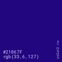 Цвет #21067F в цветовой модели RGB обозначается тремя октетами (33, 6, 127) в десятичном формате и #21067F в шестнадцатиричном (hex) формате, которые являются интенсивностью красного 33 (hex 21), интенсивность зелёного 6 (hex 06) и интенсивность синего 127 (hex 7F).