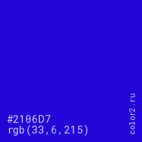 Цвет #2106D7 в цветовой модели RGB обозначается тремя октетами (33, 6, 215) в десятичном формате и #2106D7 в шестнадцатиричном (hex) формате, которые являются интенсивностью красного 33 (hex 21), интенсивность зелёного 6 (hex 06) и интенсивность синего 215 (hex D7).