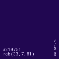 Цвет #210751 в цветовой модели RGB обозначается тремя октетами (33, 7, 81) в десятичном формате и #210751 в шестнадцатиричном (hex) формате, которые являются интенсивностью красного 33 (hex 21), интенсивность зелёного 7 (hex 07) и интенсивность синего 81 (hex 51).