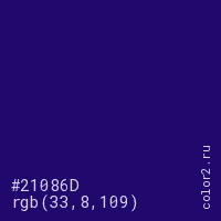 Цвет #21086D в цветовой модели RGB обозначается тремя октетами (33, 8, 109) в десятичном формате и #21086D в шестнадцатиричном (hex) формате, которые являются интенсивностью красного 33 (hex 21), интенсивность зелёного 8 (hex 08) и интенсивность синего 109 (hex 6D).
