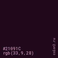 Цвет #21091C в цветовой модели RGB обозначается тремя октетами (33, 9, 28) в десятичном формате и #21091C в шестнадцатиричном (hex) формате, которые являются интенсивностью красного 33 (hex 21), интенсивность зелёного 9 (hex 09) и интенсивность синего 28 (hex 1C).