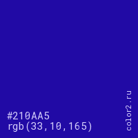 Цвет #210AA5 в цветовой модели RGB обозначается тремя октетами (33, 10, 165) в десятичном формате и #210AA5 в шестнадцатиричном (hex) формате, которые являются интенсивностью красного 33 (hex 21), интенсивность зелёного 10 (hex 0A) и интенсивность синего 165 (hex A5).