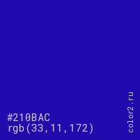 Цвет #210BAC в цветовой модели RGB обозначается тремя октетами (33, 11, 172) в десятичном формате и #210BAC в шестнадцатиричном (hex) формате, которые являются интенсивностью красного 33 (hex 21), интенсивность зелёного 11 (hex 0B) и интенсивность синего 172 (hex AC).